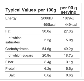 Oats 38.7, Vegetable oils 25.5%, Golden Syrup 5.38%, Brown sugar, Honey, Demerara Sugar, Bananas 6.45%, Coconut, Toasted almonds 1.08%, Dark cooking Chocolate 8.7%