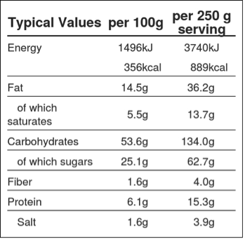 Wheat Flour 32.58%, White Sugar 10.7%, Bananas 8.88%, Eggs, Brown sugar, Cream 5.92%, Margarine polyunsaturated 4.73%, Baking powder, Soft Cheese, Vanilla extract, Lime, Coconut, Walnuts, Almonds, Potassium sorbate 0.18%, Dark cooking chocolate chips 8.88%